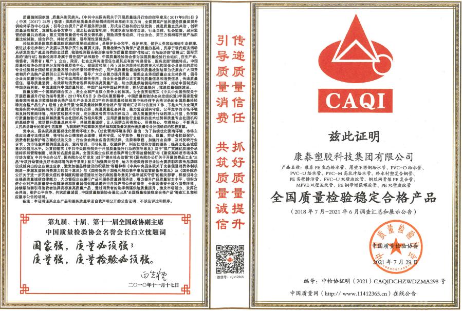 塑料管道行業(yè)是一個(gè)特殊的行業(yè),質(zhì)量是這個(gè)行業(yè)的生命線。它的好壞關(guān)系到萬(wàn)千家庭的健康與安全。自成立以來(lái),康泰始終以工匠精神締造產(chǎn)品,將產(chǎn)品的品質(zhì)放在首位,造放心產(chǎn)品,做良心工程。憑著對(duì)初心的執(zhí)著堅(jiān)守,康泰以“生態(tài)和環(huán)保”為生產(chǎn)理念,對(duì)產(chǎn)品質(zhì)量的把控始終處于行業(yè)前列,率先通過(guò)了ISO9001國(guó)際質(zhì)量體系認(rèn)證,更成為參與國(guó)家塑料管道行業(yè)標(biāo)準(zhǔn)、國(guó)家標(biāo)準(zhǔn)編寫和制定的新國(guó)貨品牌。
