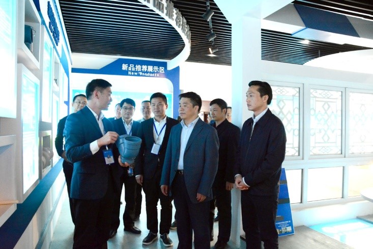 圖為康泰集團(tuán)質(zhì)量總監(jiān)徐水平在向蔡曉軍主席、趙浩宇書記介紹公司產(chǎn)品