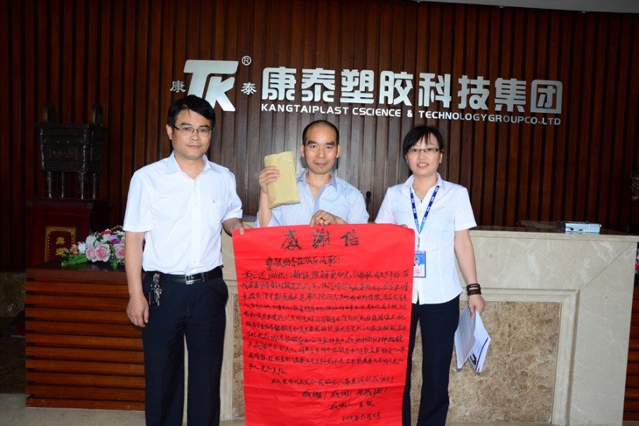 ?????? 在接收現(xiàn)場,集團工會主席吳彬和人力資源中心經(jīng)理呂旭梅熱情的接過了王敏的感謝信,同時將全體康泰人的愛心捐款和康泰愛心基金撥款共計3萬余元轉(zhuǎn)交給了王敏本人,并祝愿他早日康復,囑咐他一定要好好治病,早日回到康泰,回到工作中來。接過捐款,王敏的心情很激動。雖然他的身體還不適合大量運動,但他還是堅持要親自到公司來遞上感謝信。他說,“因為有全體各級領(lǐng)導和員工最真摯的愛心伴我同行,使我看到了康泰公司美好的未來??堤┚褪俏业募?,希望康泰公司明天更加壯大,更加美好!在這里,我代表我和我的家人最真誠的感謝公司及各位關(guān)心支持我的各位同仁、各位素不相識的人士!感謝!感謝!再感謝!”