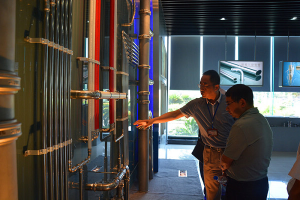 ??? 6日下午2點,考察團一行抵達集團公司,在林總裁的帶領(lǐng)下,考察團首先參觀了公司生產(chǎn)車間,其中重點參觀考察 了成品庫房、管件車間、自動卸料系統(tǒng)、模具事業(yè)部、燃?xì)馍a(chǎn)線、技術(shù)研發(fā)中心、不銹鋼公司給水部及展廳、集團公司展廳。