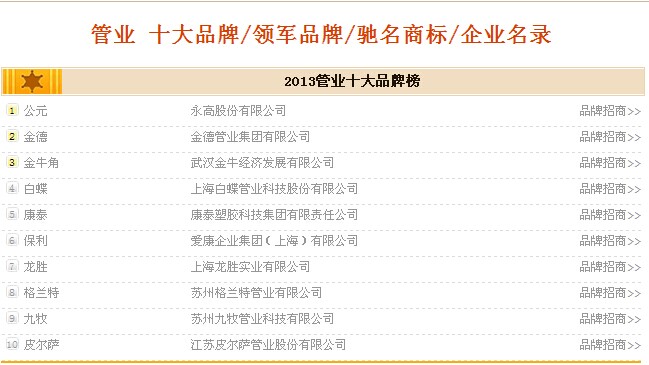 ??? 2014年6月,由品牌排行網(wǎng)主辦的“2014年度中國管業(yè)十大品牌評選” 活動于6月26日完美降下帷幕,康泰塑膠科技集團有限公司榮膺“2014年度中國管業(yè)十大品牌”。本次活動以穩(wěn)定大型企業(yè)發(fā)展、帶動行業(yè)品牌化發(fā)展為目標(biāo),以促進民族品牌為主題,面向所有行業(yè)所有品牌開放,公開評選。本次評選異?;鸨?,不但吸引了國內(nèi)近一半的管業(yè)品牌和經(jīng)銷商的參與,同時,也被新浪、網(wǎng)易、人民、新華、中國網(wǎng)等70多家知名網(wǎng)絡(luò)媒體高度關(guān)注,是國內(nèi)管業(yè)行業(yè)少有的大型權(quán)威品牌評選活動。中央電視臺、人民日報等權(quán)威媒體更是爭相報道。本次評選,不但成為管業(yè)領(lǐng)軍者齊聚的盛會,更是眾多國內(nèi)優(yōu)秀品牌嶄露頭角,表現(xiàn)自我的絕佳機會。經(jīng)過緊張激烈的網(wǎng)上投票、資質(zhì)審核以及消費者商譽評價。