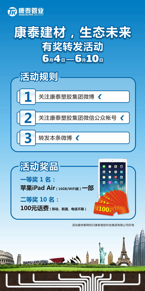 ??? 【康泰建材,生態(tài)未來】康泰管業(yè)是“生態(tài)建材”的倡導(dǎo)者,集團(tuán)總資產(chǎn)達(dá)20億。只要你在6.4-6.10日期間,關(guān)注康泰塑膠集團(tuán)新浪微博與微信帳號,同時(shí)轉(zhuǎn)發(fā)本微博,就有機(jī)會獲得我們送出的蘋果iPad Air(16GB/WiFi版)一部。另外,我們會有10個(gè)參與獎(jiǎng)的名額,參與獎(jiǎng)的獎(jiǎng)品是100元話費(fèi)。大家轉(zhuǎn)起來!