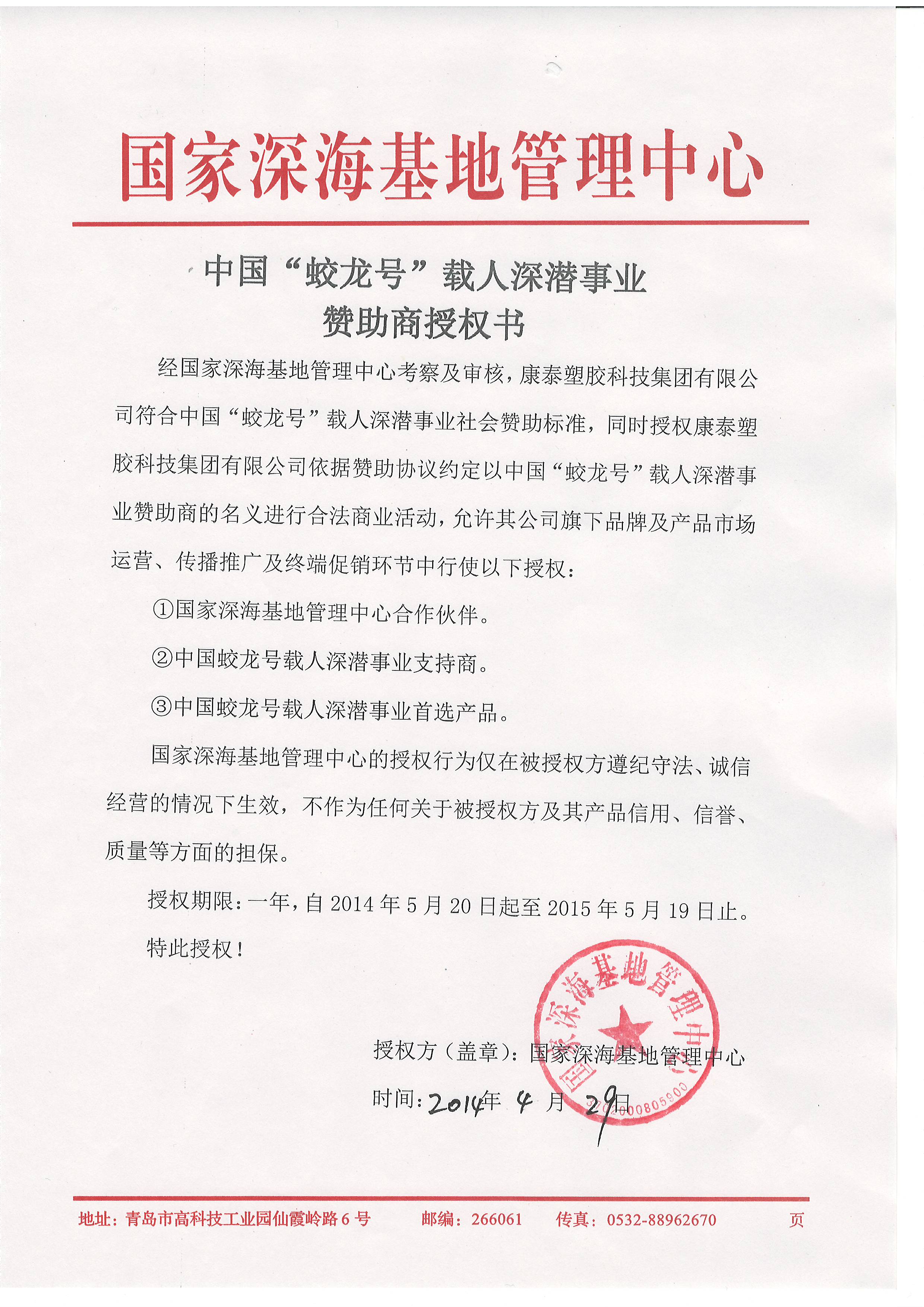 ??? 經過近半年嚴格評估,5月19日,康泰管業(yè)通過國家深海基地審核,當選為中國“蛟龍?zhí)枴陛d人深潛事業(yè)首選產品,并被授予中國“蛟龍?zhí)枴陛d人深潛事業(yè)贊助商稱號。蛟龍?zhí)柺菄腋呒夹g研究發(fā)展計劃(863計劃)重大專項,創(chuàng)造了中國載人深潛新紀錄和世界同類型載人潛水器的最大下潛深度??堤┕軜I(yè)作為中國生態(tài)建材倡導者企業(yè),本次當選為中國“蛟龍?zhí)枴陛d人深潛事業(yè)首選產品,為中國深海事業(yè)貢獻力量!