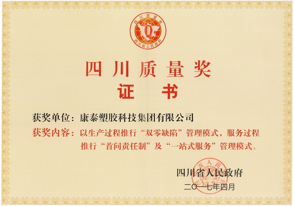 圖為第四屆四川質(zhì)量獎(jiǎng)證書(shū)