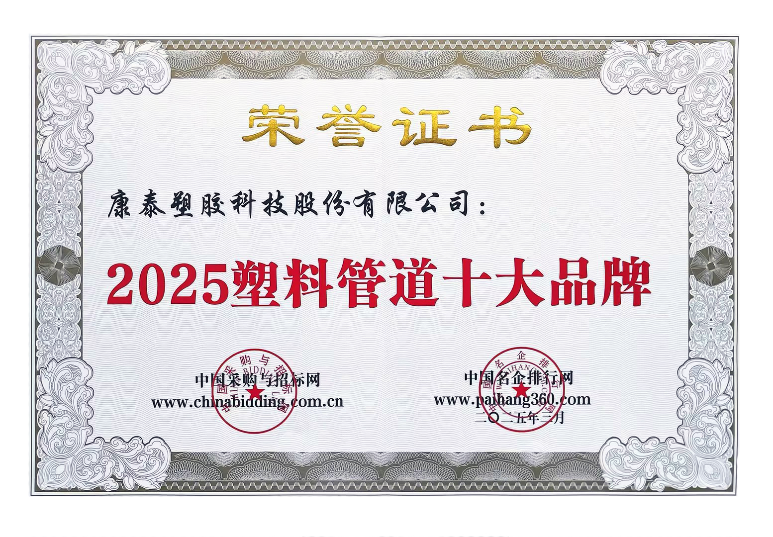 康泰集團榮膺中國輕工塑料管道行業(yè)十強企業(yè)2025/07/28 3536近日,中國塑料加工工業(yè)協(xié)會公布中國輕工塑料管道行業(yè)十強企業(yè)入圍名單,康...read more