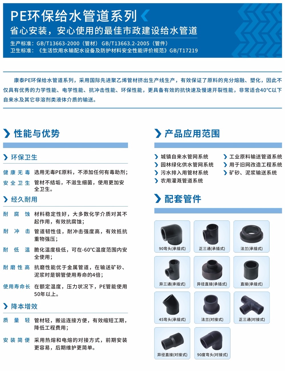 聚乙烯(PE)管是發(fā)展最快、使用量最大的塑料管道之一,其優(yōu)良的力學性能、電學性能、抗沖擊性能、環(huán)保性能,使其在給水管材產品中占有相當重要的地位,使用量越來越大??堤┡芇E給水管材采用國際先進聚乙烯管材擠出生產線生產,因其獨特篩籃式機頭設計,先進BM屏障型螺桿和IKV強制進料擠出系統(tǒng),從而保證原料的充分熔融、塑化、確保聚乙烯管材在使用中具有優(yōu)良的抗快速及慢速開裂性能。康泰牌PE給水管可用于40℃以下自來水及其它非溶劑類液體介質的輸送,管材的顏色為黑色,表面有醒目的藍色色條。長度一般為6米,9米或12米,可根據(jù)客戶要求定做。