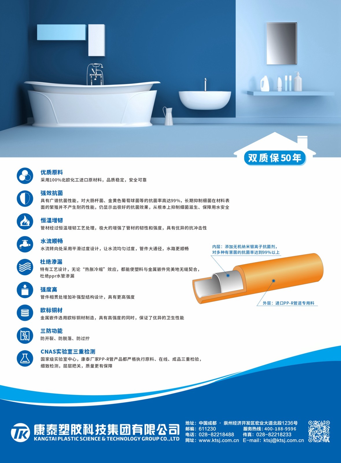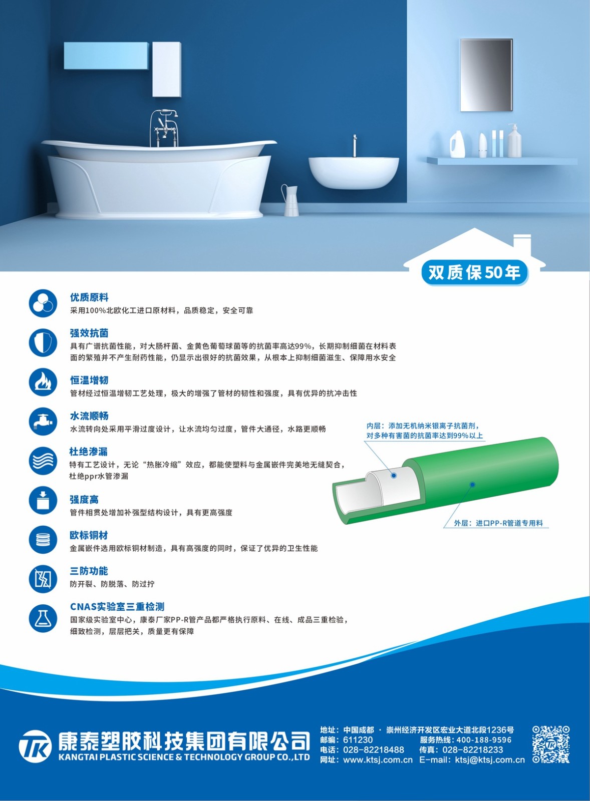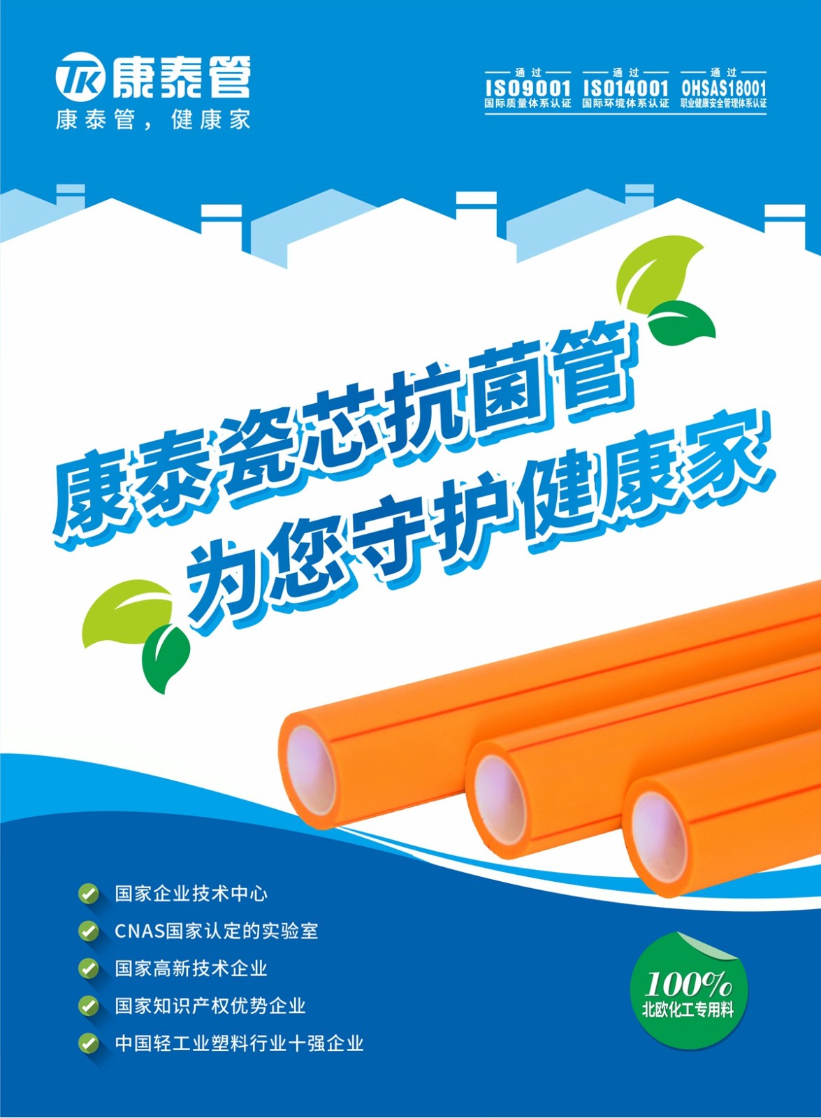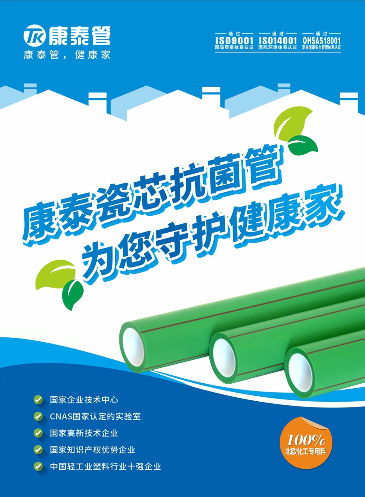 康泰PPR瓷芯抗菌管與國(guó)際頂級(jí)原材料供應(yīng)商北歐化??期合作,100%北歐化?進(jìn)?原材 料,從源頭上確保產(chǎn)品質(zhì)量,確保家庭??的安全健康。