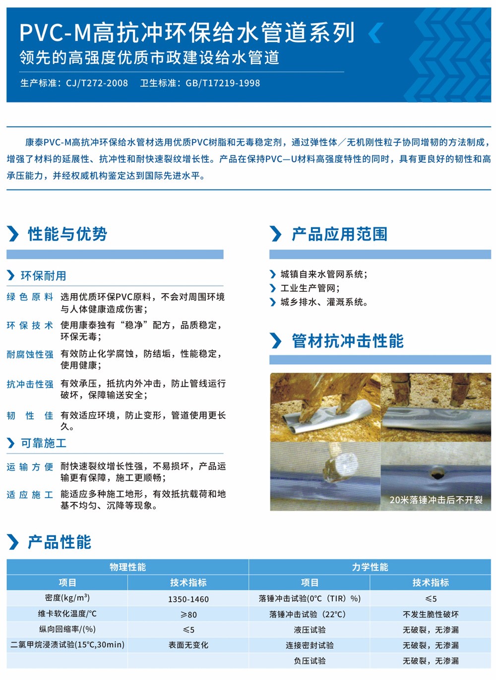 康泰塑膠科技集團(tuán)有限公司生產(chǎn)的PVC-M高抗沖環(huán)保給水管材是在優(yōu)選PVC樹(shù)脂、無(wú)毒穩(wěn)定劑的基礎(chǔ)上,通過(guò)彈性體/無(wú)機(jī)剛性粒子協(xié)同增韌的方法制成的,采用該工藝生產(chǎn)的PVC-M高抗沖環(huán)保給水管材在保持PVC-U材料高強(qiáng)度特性的同時(shí),具有更良好的韌性和高承壓能力,增強(qiáng)了材料的延展性、抗沖性、耐快速裂紋增長(zhǎng)性。產(chǎn)品經(jīng)國(guó)家塑料制品質(zhì)量監(jiān)督檢測(cè)中心、四川省、河南省衛(wèi)生檢測(cè)中心等權(quán)威機(jī)構(gòu)檢測(cè),其衛(wèi)生性能、物理性能和力學(xué)性能完全符合相關(guān)國(guó)家標(biāo)準(zhǔn)和企業(yè)標(biāo)準(zhǔn),經(jīng)專(zhuān)家委員會(huì)鑒定達(dá)到國(guó)際先進(jìn)水平。