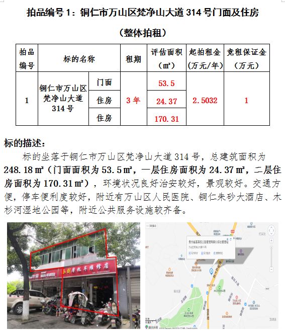 一、銅仁市萬山區(qū)梵凈山大道314號(hào)門面及住房3年租賃權(quán)建筑面積:248.18);