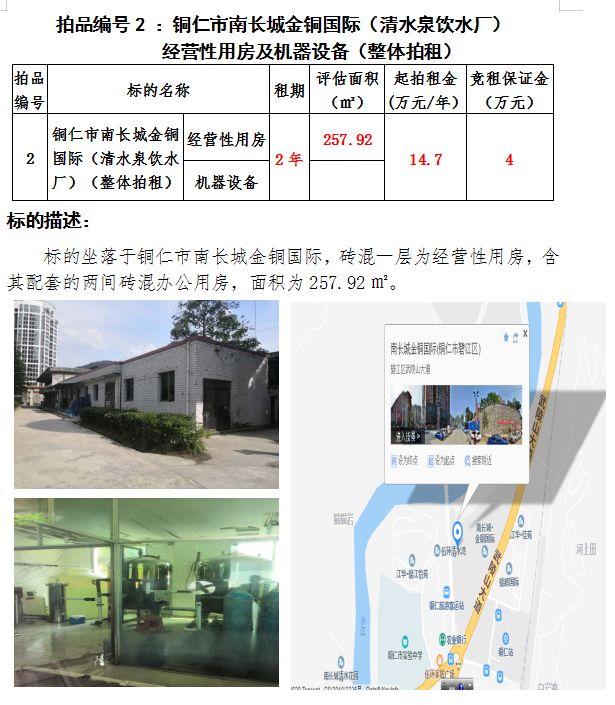 二、銅仁市南長城金銅國際(清水泉飲水廠)經(jīng)營性用房及機(jī)器設(shè)備2年租賃權(quán)(建筑面積:257.92㎡);
