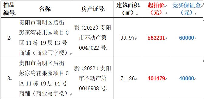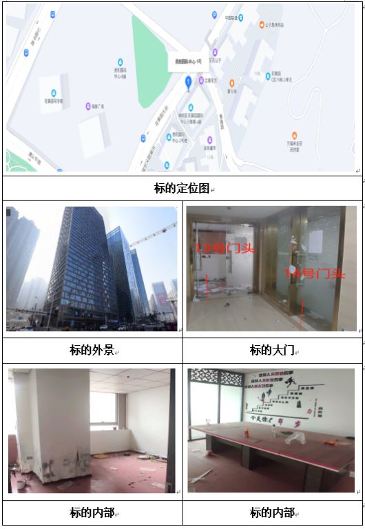 標(biāo)的位于貴陽市南明區(qū)花果園彭家灣花果園C區(qū)(貴陽國際中心1號(hào))11棟1單元19層13號(hào)、14號(hào)花果園商鋪(商業(yè)寫字樓),其中標(biāo)的2號(hào)建筑面積為99.97㎡、套內(nèi)面積為73.48㎡;標(biāo)的3號(hào)建筑面積為71.26㎡、套內(nèi)面積為52.38㎡。房屋為一般裝修,包含水電敷設(shè)及安裝、地面地磚、墻面刷瓷粉及乳膠漆、頂面鋁扣板吊頂、玻璃門。用途為辦公,鋼混結(jié)構(gòu),建成時(shí)間為2013年8月,所在層數(shù)19層,目前均為空置狀態(tài)。