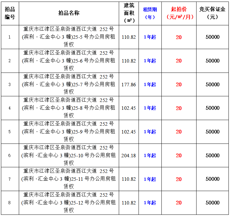 1、重慶市江津區(qū)圣泉街道西江大道 252號(hào)(濱利·匯金中心3幢) 25 層辦公用房8間租賃權(quán),建筑面積:102.45㎡-204.18㎡,租賃權(quán)起拍價(jià):20元/㎡/月/間,競(jìng)買保證金:5萬(wàn)元/間。