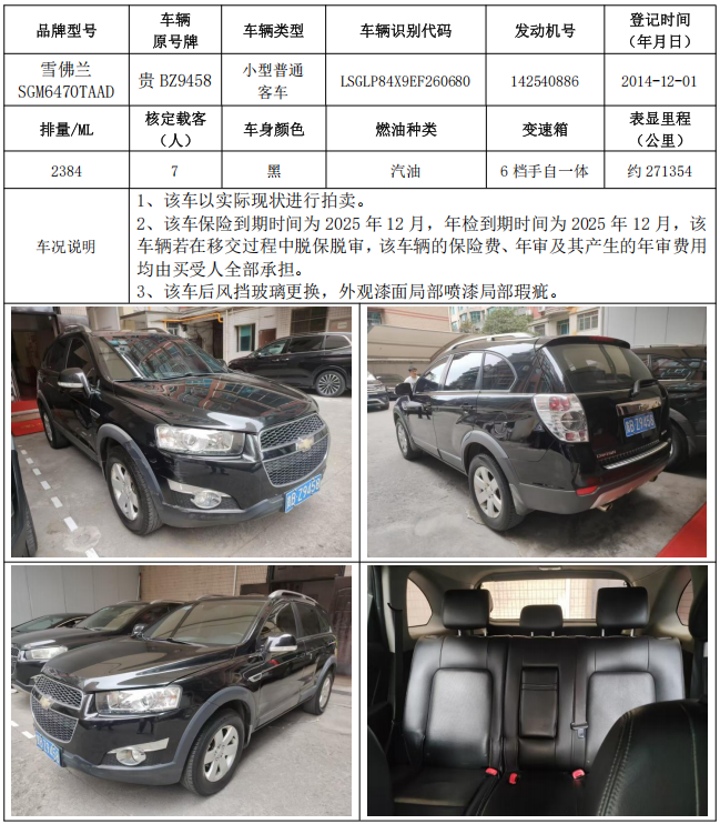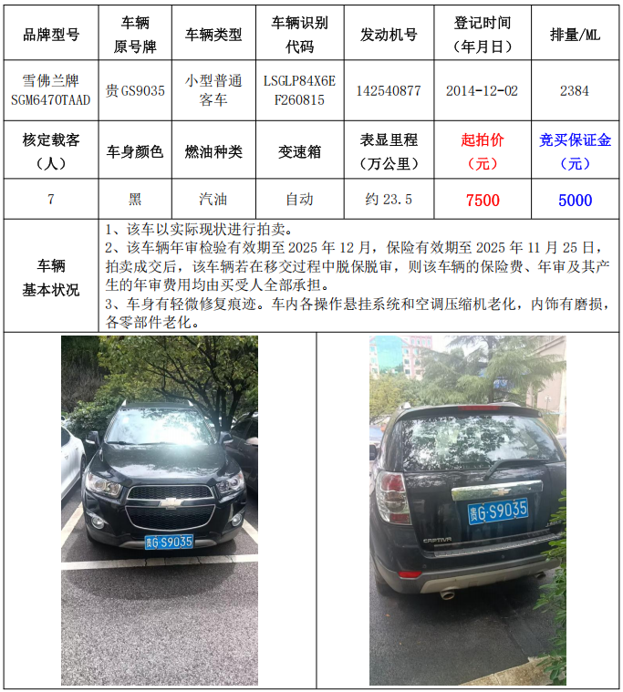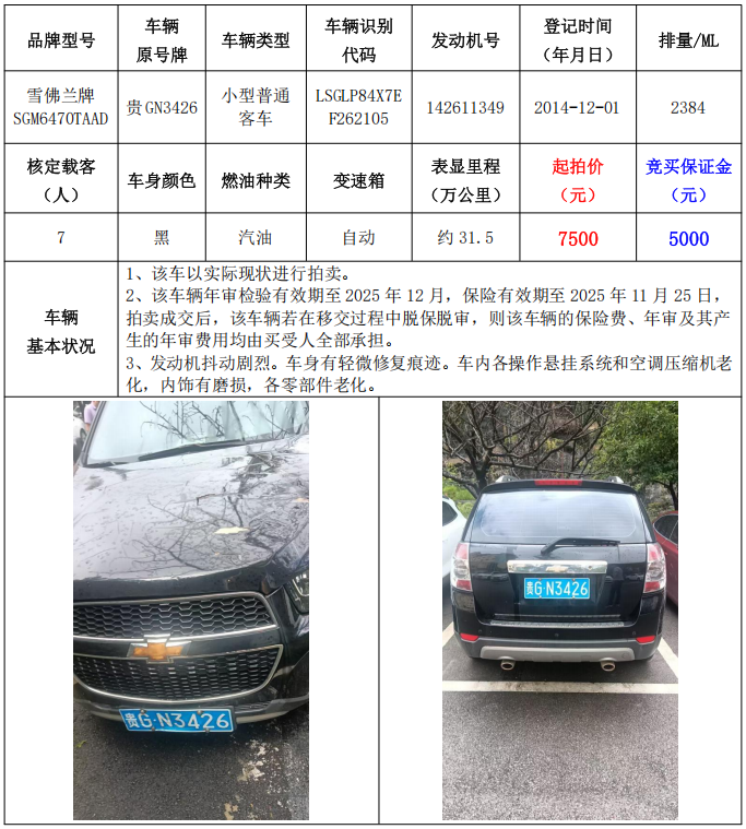1、雪佛蘭牌SGM6470TAAD小型普通客車1輛,起拍價:7500元,競買保證金:5000元。