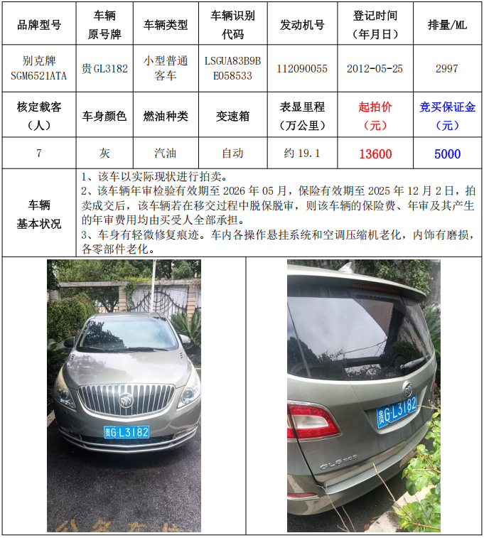 3、別克牌SGM6521ATA小型普通客車1輛,起拍價:13600元,競買保證金:5000元。