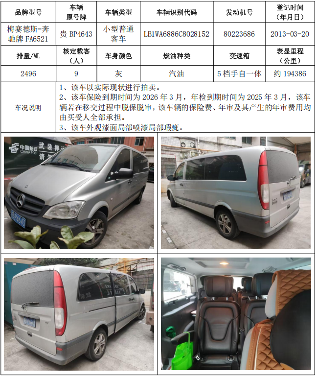 4、雪佛蘭牌SGM6470TAAD小型普通客車1輛、梅賽德斯-奔馳牌FA6521小型普通客車1輛,共計2輛,整體拍賣,起拍價:33200元,競買保證金:5000元。